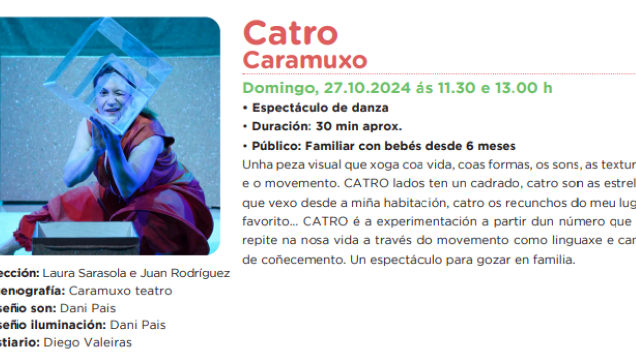 CATRO lados ten un cadrado, catro son as estrelas que vexo desde a miña habitación, catro os recunchos do meu lugar favorito... CATRO é a experimentación a partir dun número que se repite na nosa vida a través do movemento como linguaxe e canle de coñecemento. Un espectáculo para gozar en familia.