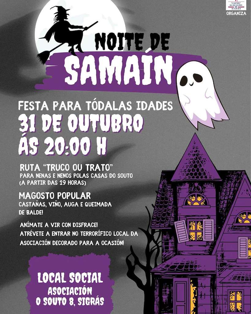 El local de la Asociación Vecinal O Souto acogerá la fiesta de Samaín el 31 de octubre desde las 20.00 horas. Un poco antes, a las 19.00 horas, los niños podrán hacer una ruta de Truco o Trato por las casas de O Souto. A las ocho empezará la fiesta con magosto popular de castañas, vino, agua y queimada gratuita.