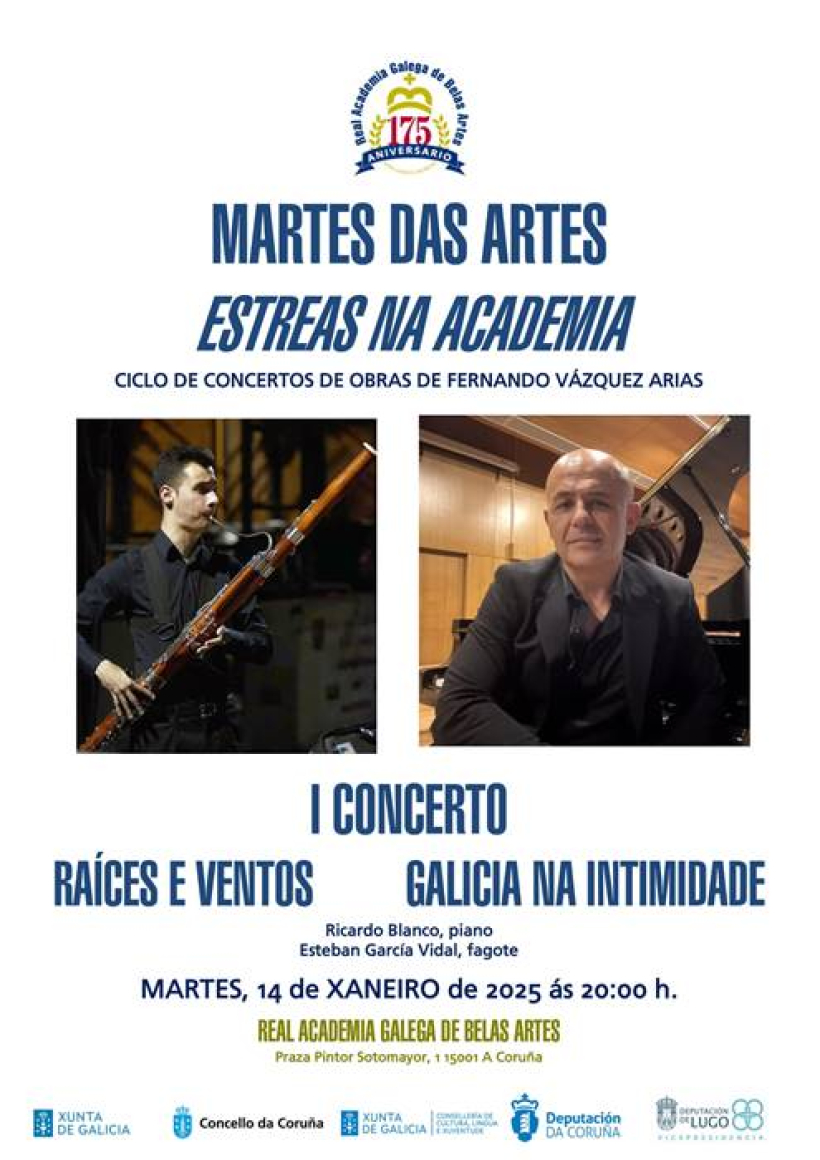 O martes 14 de xaneiro terá lugar ás 20 horas na Real Academia Galega de Belas Artes o concerto “Raíces e Ventos, Galicia na intimidade” o primeiro dun ciclo de recitales titulado “Estreas na Academia” na que se interpretarán obras de Fernando Vázquez Arias.