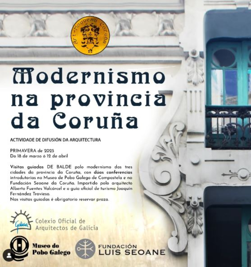 Se trata de un conjunto de visitas guiadas gratuidas por el modernismo de las tres ciudades de la provincia de A Coruña, con dos conferencias introductorias en el Museo de Pobo Galego de Compostela y en la Fundación Luis Seoane de A Coruña. Impartido por el arquitecto Alberto Fuentes Valcárcel y el guía oficial de turismo Joaquín Fernández Travieso.