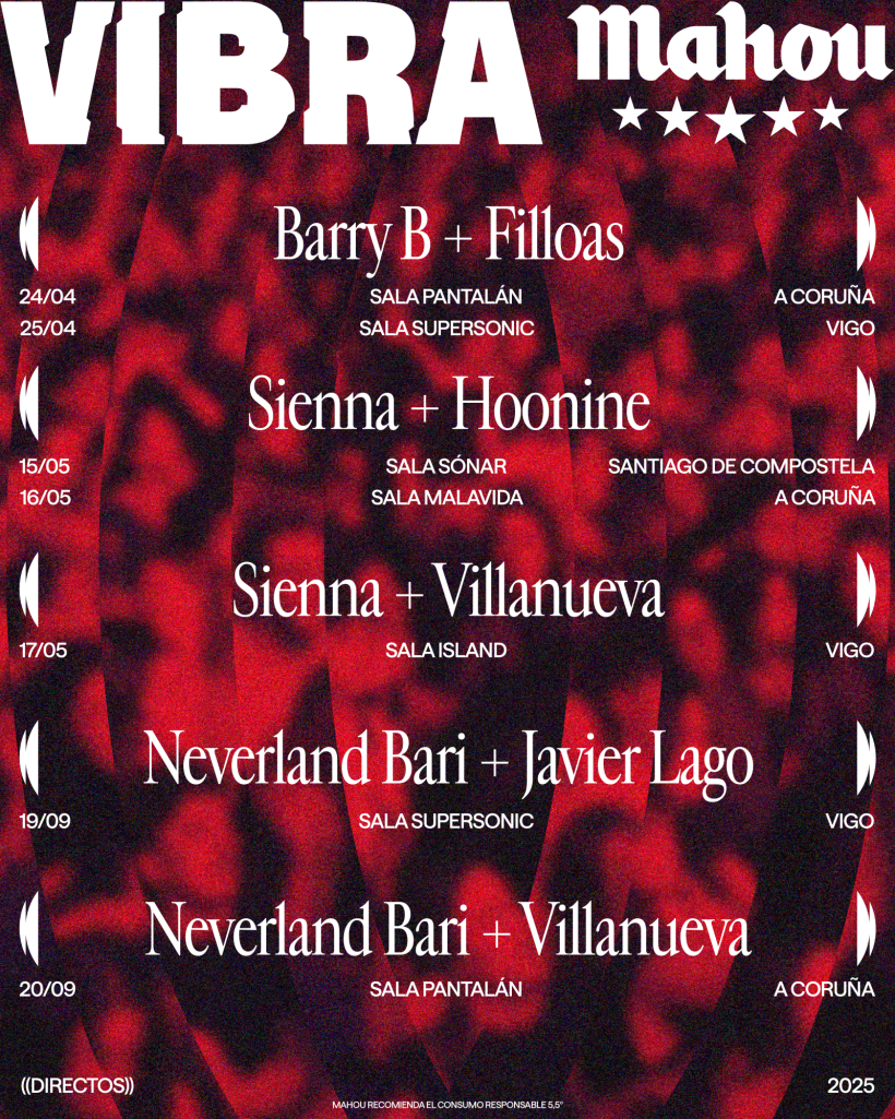 En mayo, Sienna, artista valenciano que presenta en Galicia “Trance”, un trabajo que marca una nueva etapa en su trayectoria, con un sonido más electrónico y una puesta en escena más poderosa. Estará acompañado por Hoonine, una de las voces más personales de la nueva escena alternativa, con influencias del house, el future garage o el synthpop, y una propuesta que ha conquistado a grandes festivales a nivel nacional. Las fechas: el 15 de mayo en la Sala Sónar de Santiago de Compostela y el 16 de mayo en la Sala Malavida de A Coruña.