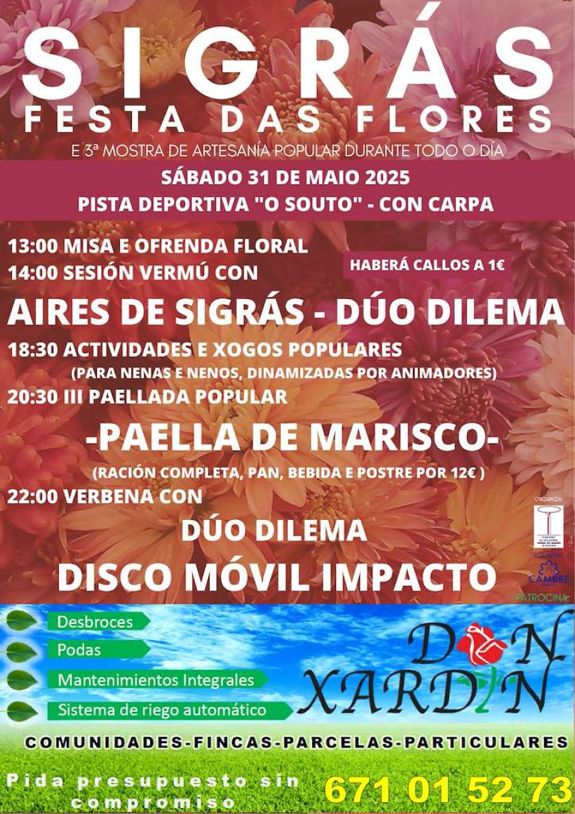 La parroquia cambresa de Sigrás celebra el sábado 31 de mayo la Fiesta de las Flores en la pista deportiva de O Souto. La jornada comenzará con una misa solemne y una ofrenda floral. La sesión vermú será a cargo de Aires de Sigras y el Dúo Dilema.