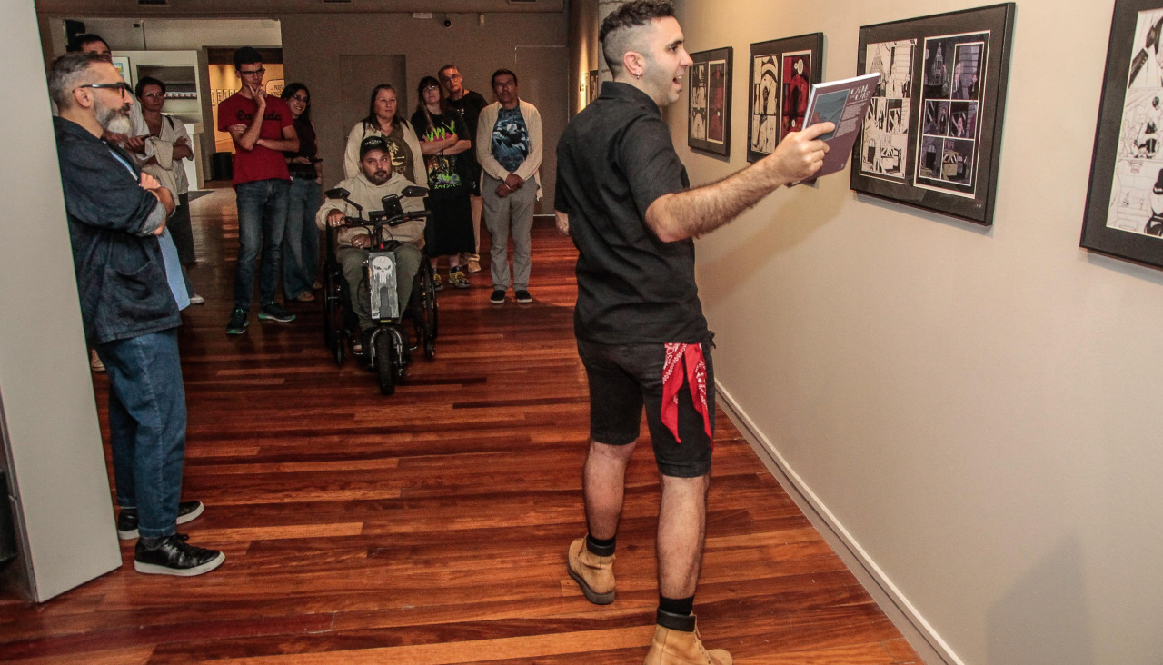 Pero algunas de sus páginas expuestas sí son originales. "Aquí lo hizo todo a pluma. Me llevó muchísimo tiempo. Me manché los dedos, la ropa. No tiene sentido. Pero quedó bonito porque es un instrumento muy noble la pluma. Uno se siente un maestro del Renacimiento". En una vitrina se exhibía varios folletos de grupos de rock. "Todos son Satán-algo", comentó. En otros, se veía personajes musculados. "Siempre coqueteo con el estilo Jack Kirby, es muy poderoso".