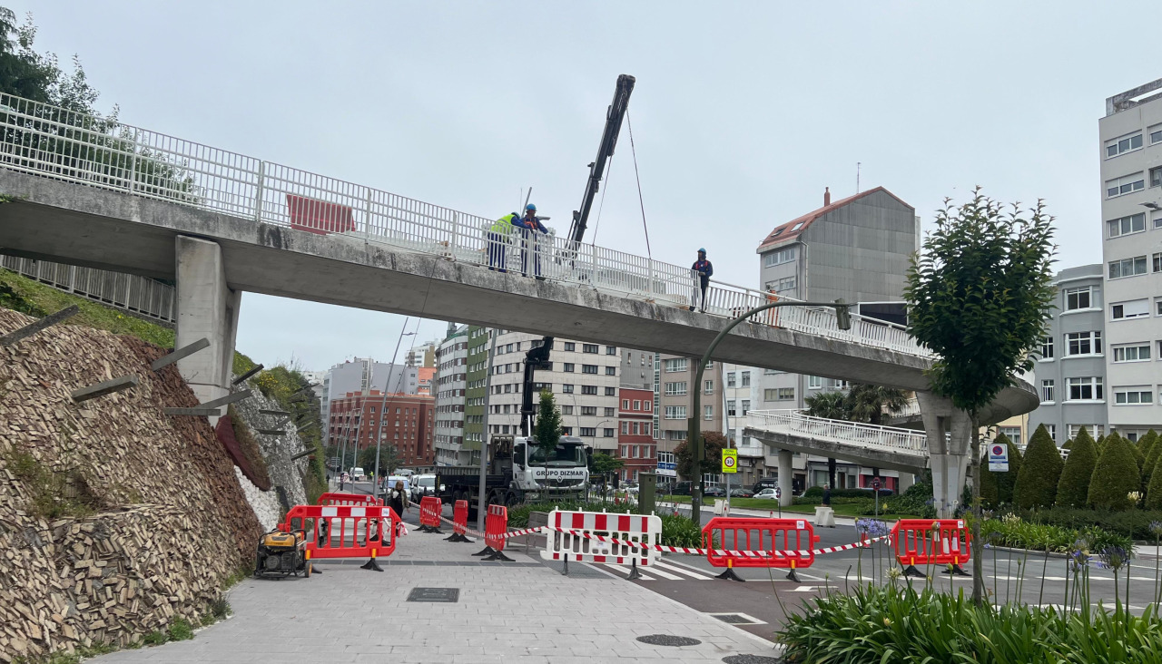 La avenida de Arteixo está en obras: nuevas aceras, nuevo asfalto, nuevo carril bici... Y nuevas barandillas para la pasarela que lo atraviesa para llegar al parque de Santa Margarita. Los obrero retiran esta mañana las viejas protecciones oxidadas para sustituirlas por otras nuevas, lo que obliga a interrumpir el tráfico de tanto en tanto.