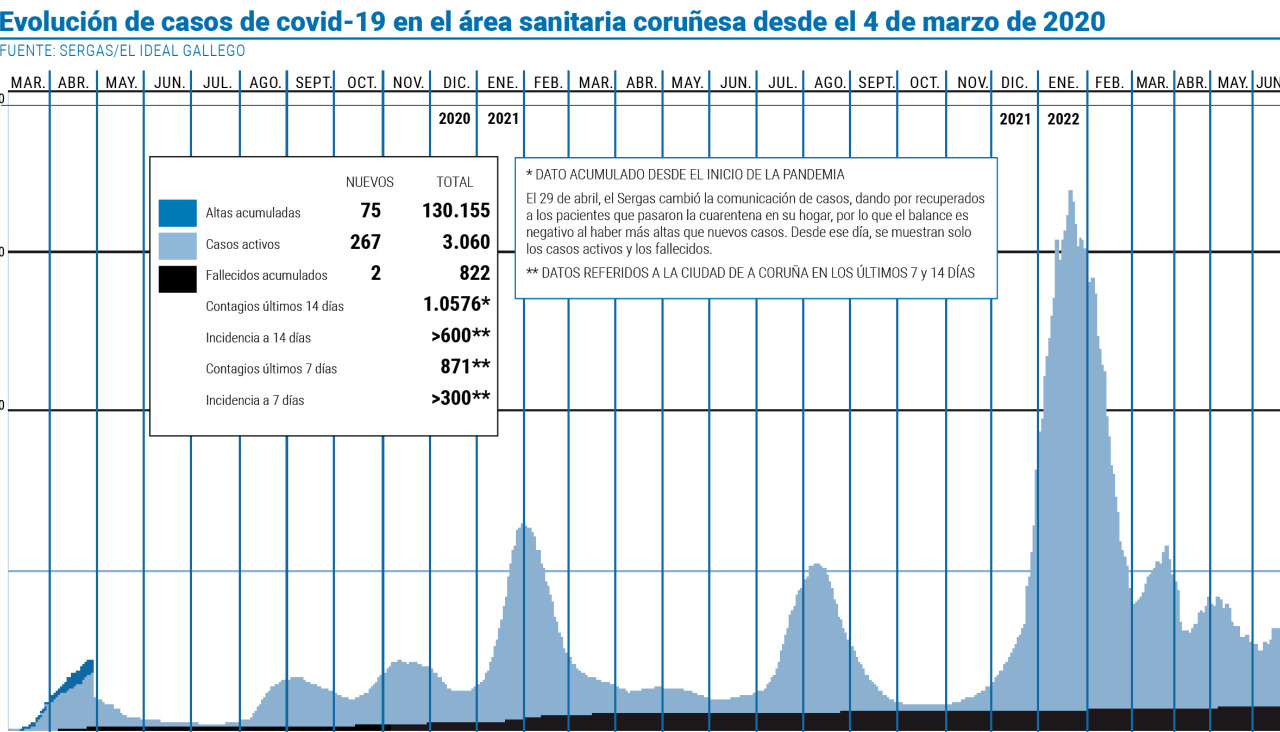 Según el último balance de datos hecho público ayer por el Servizo Galego de Saúde (Sergas), el número de personas con el contagio en activo en la demarcación sanitaria ascendía hasta los 3.060, lo que supone un alza de 267 casos con respecto al pasado jueves y de más de 1.400 si se compara con las cifras registradas a principios de mes (1.602 personas contagiadas el 7 de junio).