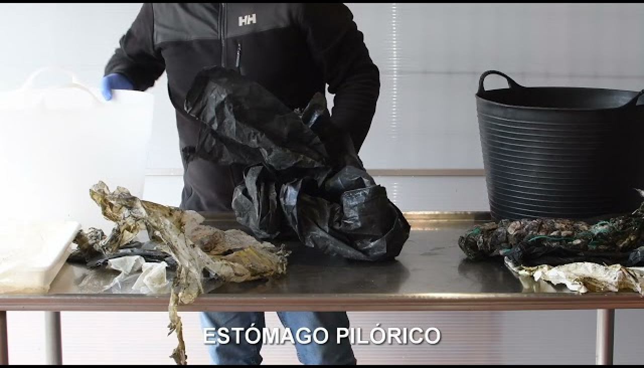 En el vídeo se pueden ver enormes bolsas completas halladas en el estómago principal del cetáceo, cuerdas y redes, fundas en el estómago pilórico, y ya pedazos de plástico más digeridos procedentes del intestino.