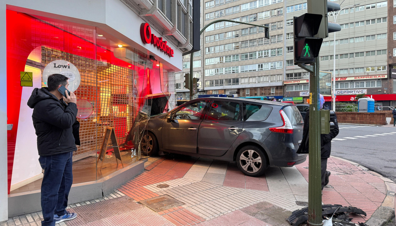 Un coche se empotró este martes por la mañana contra la tienda Vodafone de la plaza de Pontevedra, en A Coruña.