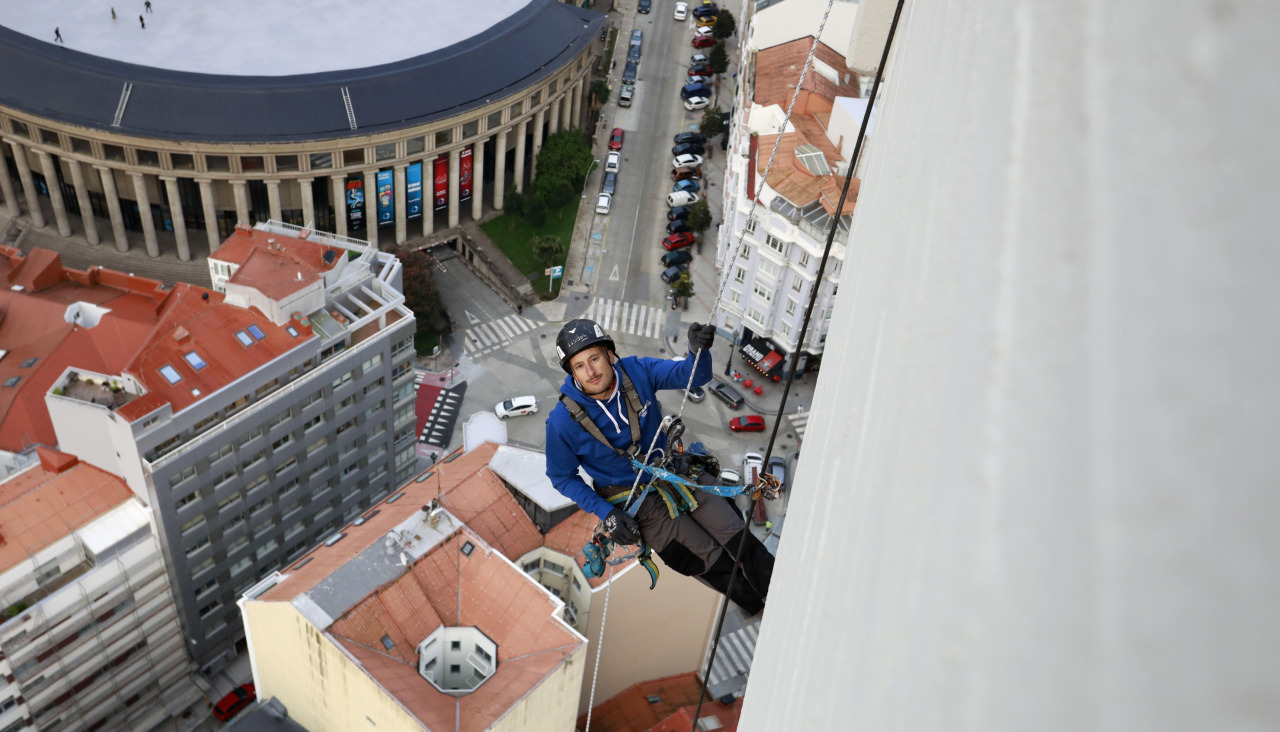 El destino ha querido que sean dos amigos de la infancia los que se cuelguen de las cuerdas en esta ocasión. Richi Hermida y Carlos Buhigas se conocen desde que tenían 12 años, hace ya dos décadas, pero la unión laboral ha sido casi fruto de la casualidad. Richi es el veterano. Son ya ocho años viendo A Coruña desde las alturas, aunque nunca una como esta. “Empecé en la construcción cuando estaba con un FP de Comercio y Marketing, pero complementé mi formación con cursos de altura vertical, así como Formacion en Alturas y Trabajos Verticales”, recuerda el especialista.