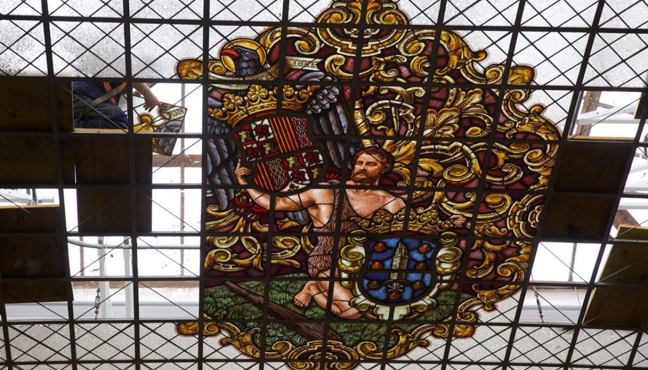 La vidriera del palacio municipal, creada en la segunda mitad del siglo XX contaba con un escudo franquista que, en 2019, se encargó eliminar a la entidad.