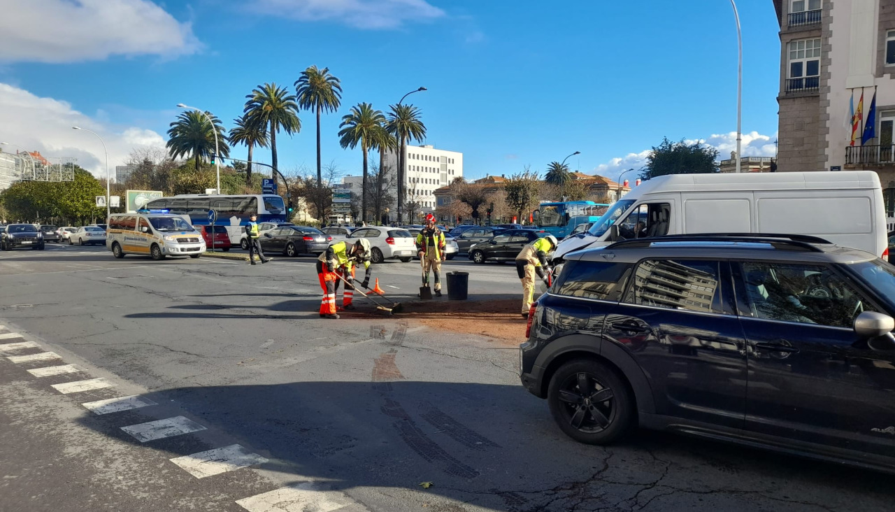 Los bomberos emplearon sustancias dispersantes para asegurarse de eliminar todo el líquido derramado. En todo caso, aunque la furgoneta se encontraba muy dañada en su frontal, pudo arrancar para despejar el centro de la plaza y estacionar a un lado, donde tuvo que esperar la grúa durante un buen rato. Mientras tanto, la avenida del Puerto, que ya de por sí es una de las arterias más saturadas de la ciudad, se colapsaba: una larguísima cola comenzó a formarse en el cruce y se introdujo por el túnel de María Pita hasta salir por As Atochas y llegar a la plaza de España.