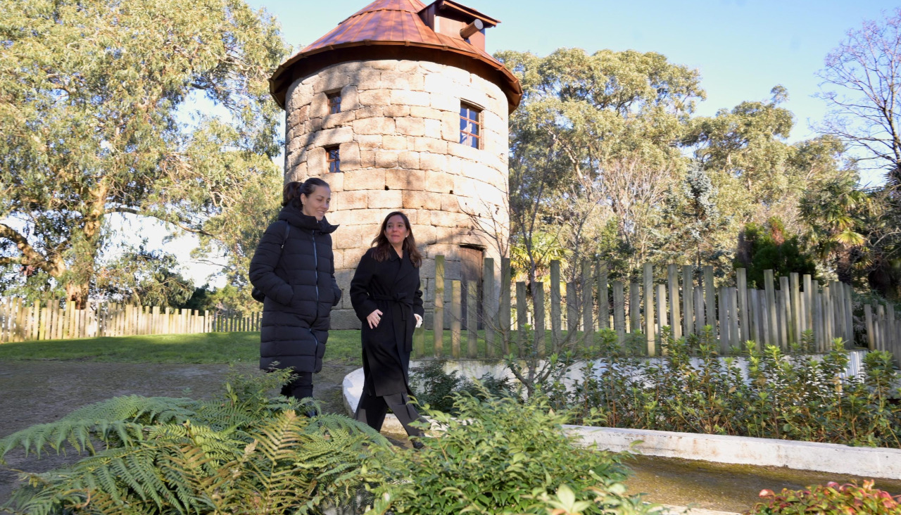 Nueva cubierta e imagen renovada para uno de los elementos más característicos del parque de Santa Margarita, su molino. La alcaldesa, Inés Rey, acompañada de la concejala de Infraestructuras, Noemí Díaz, supervisó este viernes los trabajos que se llevaron a cabo para completar la restauración del molino, iniciada en el paso mandato con su integración con el estanque.