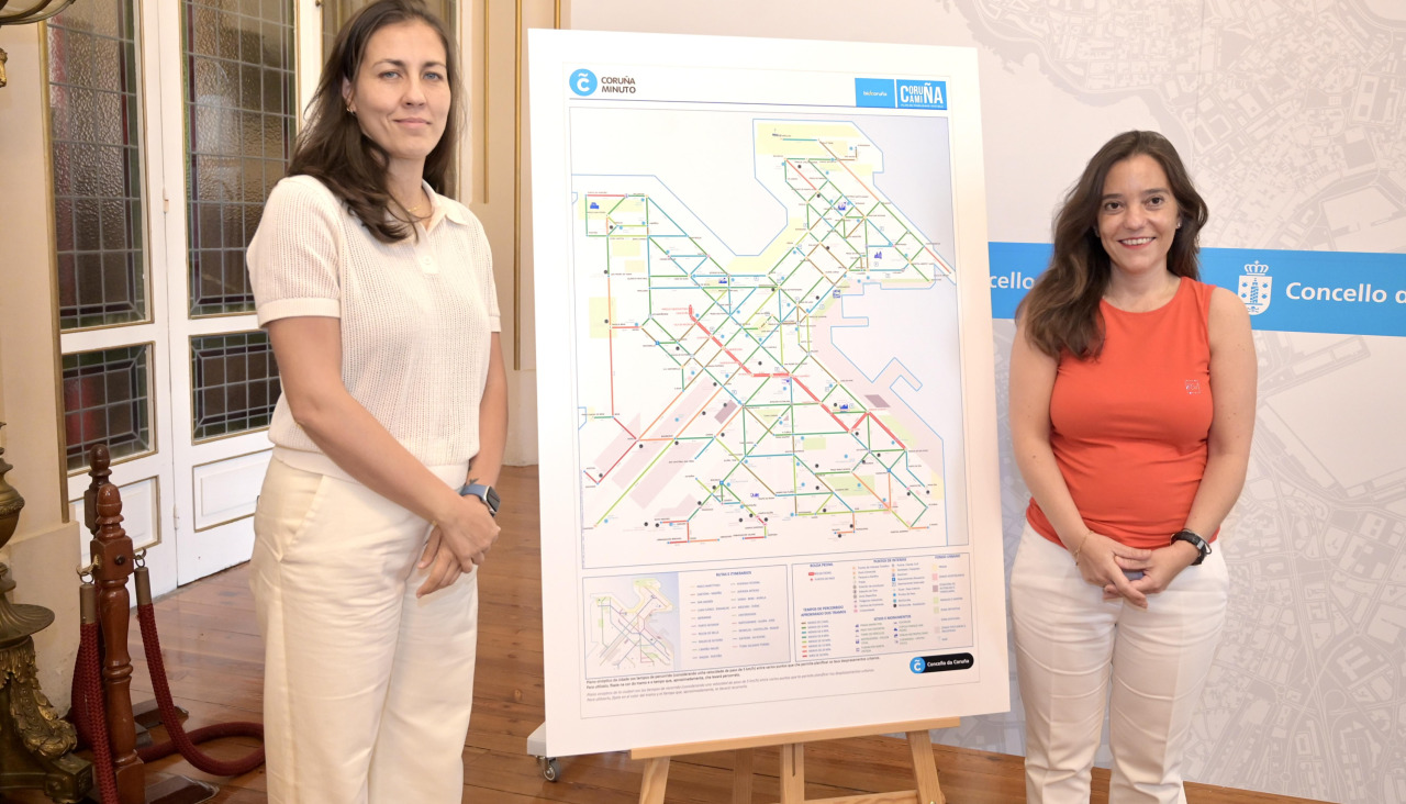 Para fomentar más la movilidad blanda, Inés Rey presentó el mapa ‘Coruña minuto’, en el que es posible ver numerosos trazados y calles peatonales de la ciudad, así como el tiempo de recorrido a pie si una persona camina a cinco kilómetros por hora.