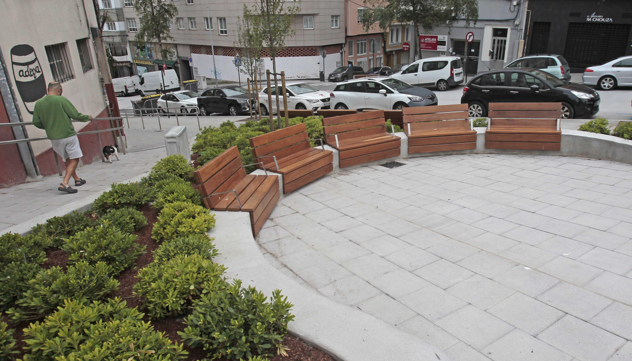 En algunas de las humanizaciones más importantes que ha llevado a cabo el Gobierno de Inés Rey se observa este modelo en el que los bancos están enfrentados, como invitando al público a sentarse y a hablar. Pla y Cancela, que ha costado un millón de euros, es solo el ejemplo más nuevo. Otro muy reciente es la de rampa de Matadero. La obra, que sufrió un retraso de seis meses (algo bastante habitual en las obras municipales en A Coruña) supuso un coste de 584.000 euros, la mayor parte de ellos procedentes de fondos europeos, pero permitió crear una zona de estancia nueva justo frente a la bahía de Riazor, pero alejada del trasiego del Paseo Marítimo.