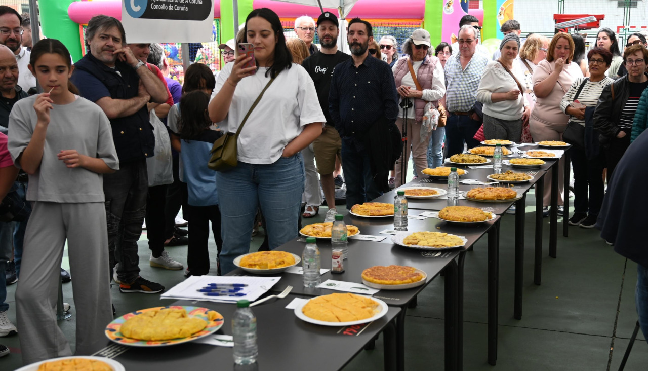 La pista polideportiva de la Sagrada Familia se engalanó para ser, un año más, el epicentro coruñés de culto de la tortilla de patatas. Así, pasadas las 12.45 horas de hoy, más de una veintena de participantes dejaron su elaboración sobre una gran mesa. Con cebolla o sin ella, rellena de chorizo, de queso o, incluso, de espinacas, eran algunas de las propuestas más atrevidas.