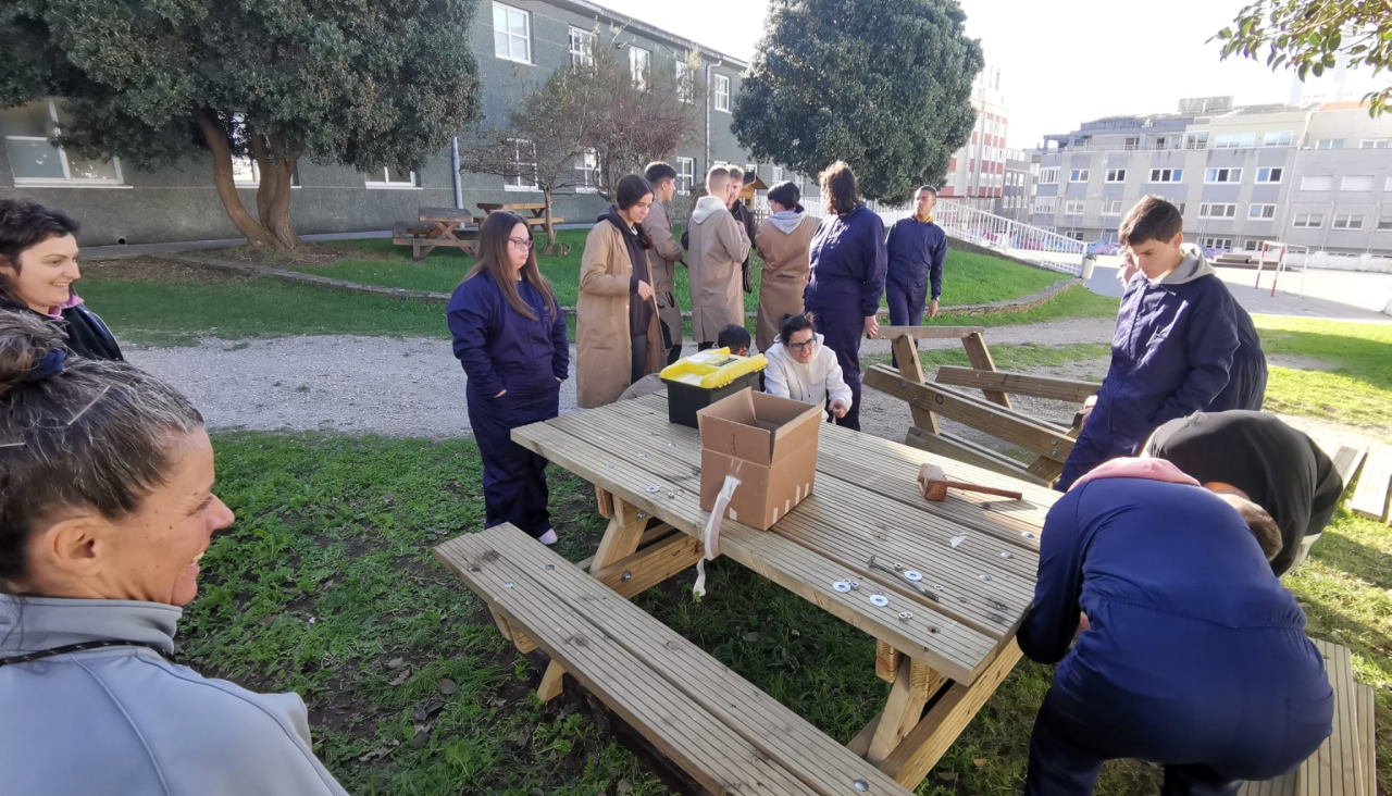 Desde el Centro Penitenciario de Teixeiro se decide realizar mesas y murales de madera para mejorar los patios de varios centros educativos de A Coruña. Para eso el alumnado del instituto de Formación Profesional Rosalía Mera diseñó en el aula estos elementos y se desplazó hasta el centro penitenciario para formar a los participantes que se encargarán de la producción para todos los centros educativos participantes.