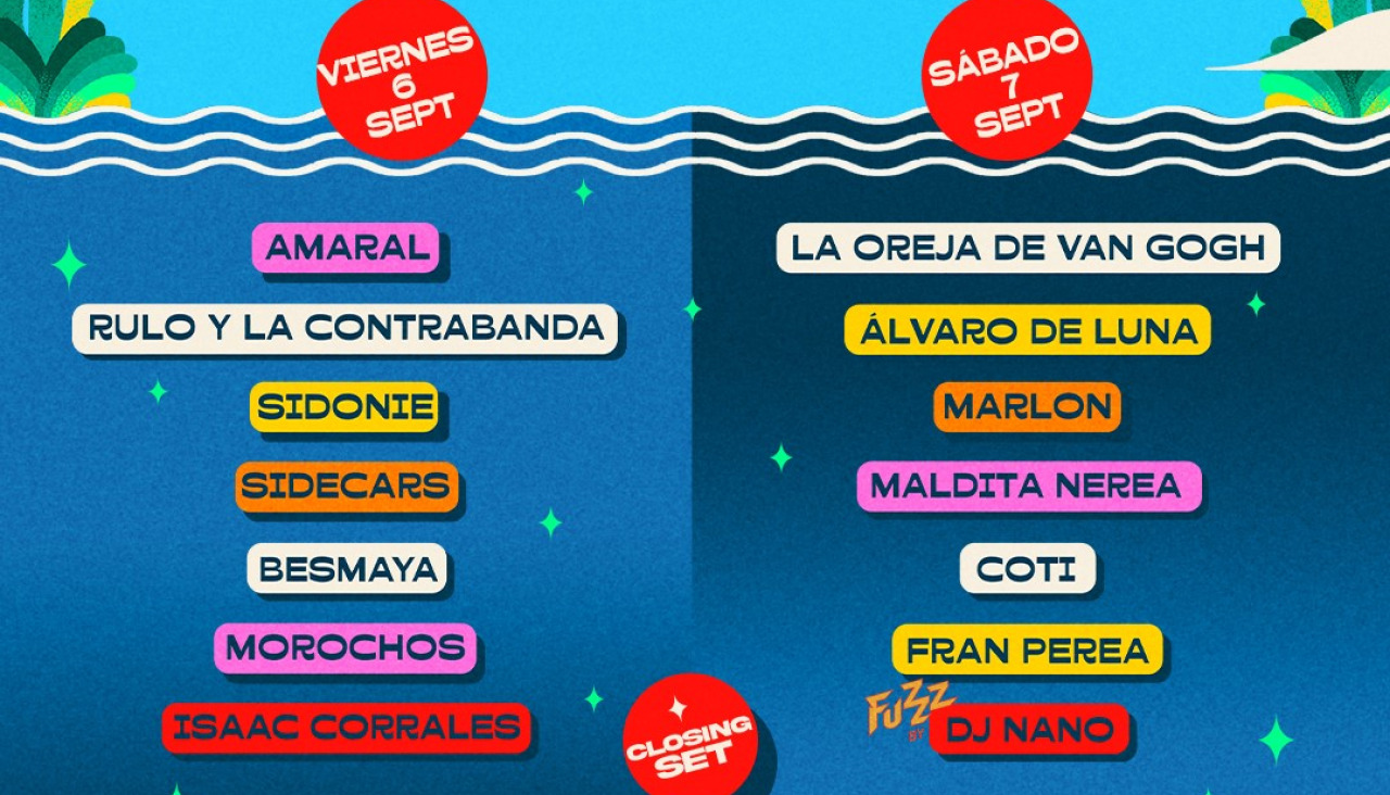 Amaral encabezará la programación para el viernes 6 de septiembre, junto a Rulo y la Contrabanda, Sidonie, Sidecars, Besmaya, Morochos y DJ Isaac Corrales. La Oreja de Van Gogh hará lo propio para el sábado 7 de septiembre junto a Álvaro de Luna, Marlon, Maldita Nerea, Coti, Fran Perea y DJ Nano.