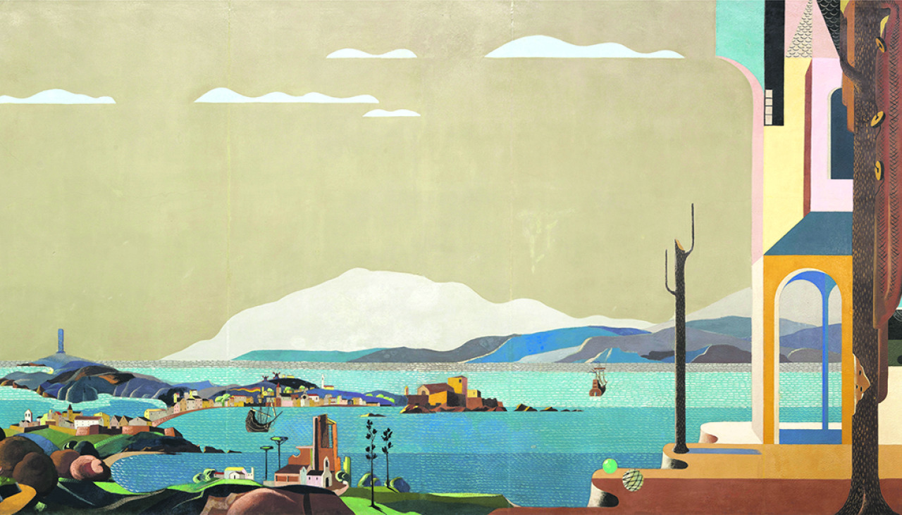 1946. La primera, una vista portuaria. Galeones, San Antón, la Ciudad Vieja con sus iglesias y los molinos de la Torre son algunos de los elementos que Lugrís emplea en esta primera vista y repetirá después. Pero hay algo que no repetirá: la representación del faro con parte del viejo muro exterior aún en pie.
