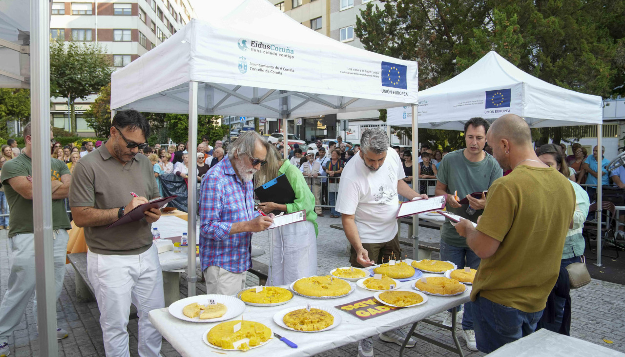 Si un extraterrestre aterriazase en O Castrillón y hubiera que explicarle por qué cada vez más vecinos consideran una de las citas del año ponerse detrás de una valla a ver cómo media docena de empresarios prueban medio centenar de tortillas, seguramente cortocircuitaría. Puede que en el barrio aún exista aquel sentimiento de la abuela gallega de toda la vida, que disfrutaba viendo comer a los demás. O también puede considerarse algo así como el seguimiento de la creación de buena parte de ellos. Porque al menos 54 personas tenían interés en ser coronado ‘mejor tortillero’ en la XVI edición del concurso de la especialidad. El honor recayó sobre Luis Fernández Gende, un transportista jubilado, vecino de la zona, y cuya creación es sincebollista y de proximidad, pues las patatas son cosa de Frutas Esteban y de huertas del entorno.