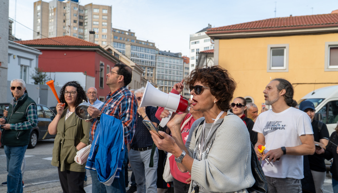 El número 58 de la calle Vizcaya es hoy en día el campeón de la indignación y el que provoca la unión de los rostros conocidos de las protestas vecinales. Por segunda semana consecutiva los inquilinos, cacerola en mano y vuvuzela de plástico en boca, recibieron el apoyo de asociaciones como la Plataforma Veciñal de Os Mallos o la de Los Rosales. Durante casi una hora aproximadamente medio centenar de indignados le miraron a los ojos a las ventanas del mercado de la droga. “Drogas no”, “Estamos hasta el culo de tanto narco chulo” y apelaron a la alcaldesa: “Inés, escoita, Os Mallos está en loita”.