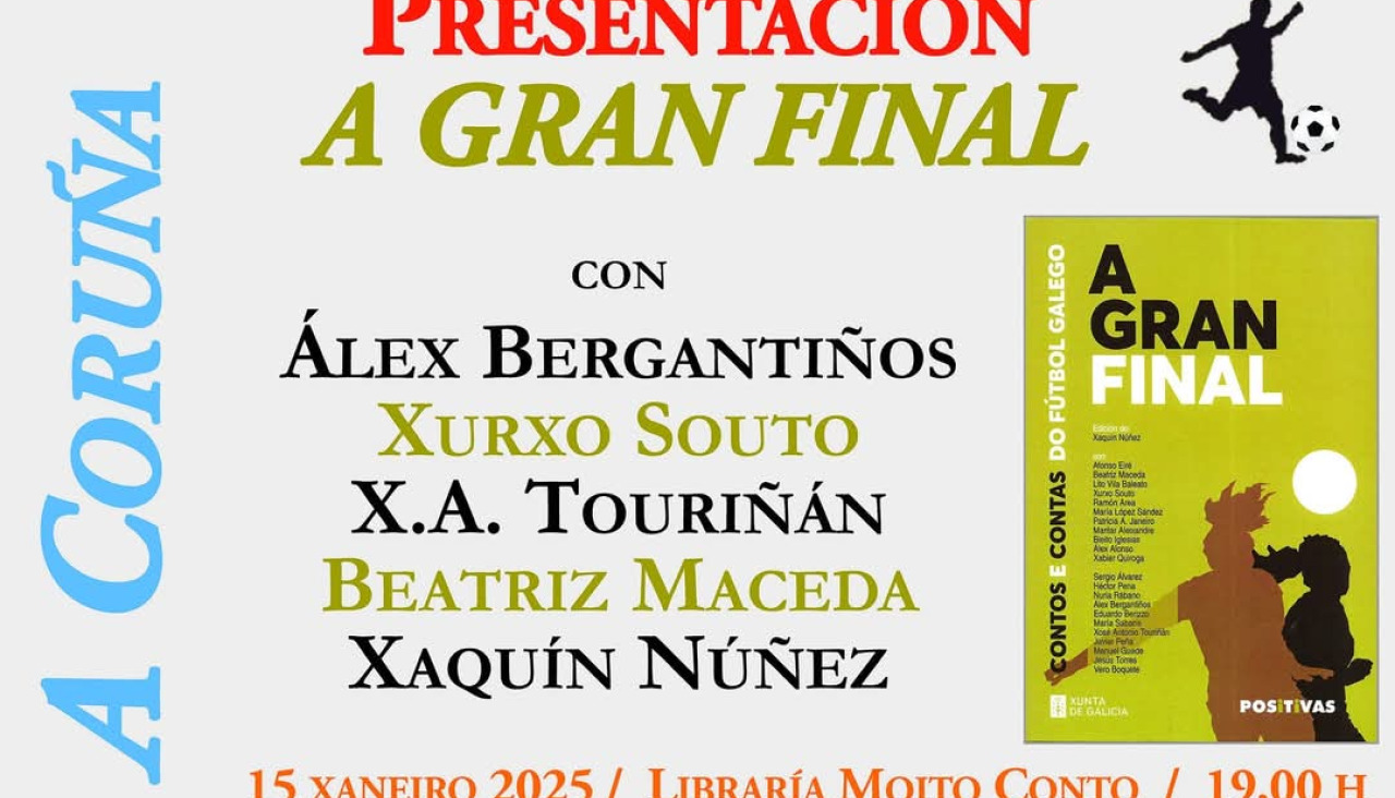 Que el fútbol y la literatura son amigos no es algo que ya sorprenda, pero sí que un libro sea capaz de reunir los "cuentos" futboleros de unos escritores y las "cuentas" con el deporte de algunos de sus protagonistas. Eso es lo que hace 'A gran final', el libro de Positivas que sienta a la mesa literaria a personas como el exdeportivista Álex Bergantiños, el actor Xosé A. Touriñán o el músico Xurxo Souto.