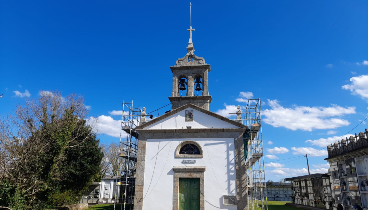 Aunque los trabajos de reparación del recinto religioso todavía no han finalizado (prueba visible y palpable son los andamios instalados en los laterales), en lo que respecta a la estructura que soporta las campanas ya no queda mucho por añadir. Una cruz corona la espadaña de granito, al tiempo que soporta un barra metálica que, se supone, recibirá los impactos eléctricos cuando se desate una tempestad.