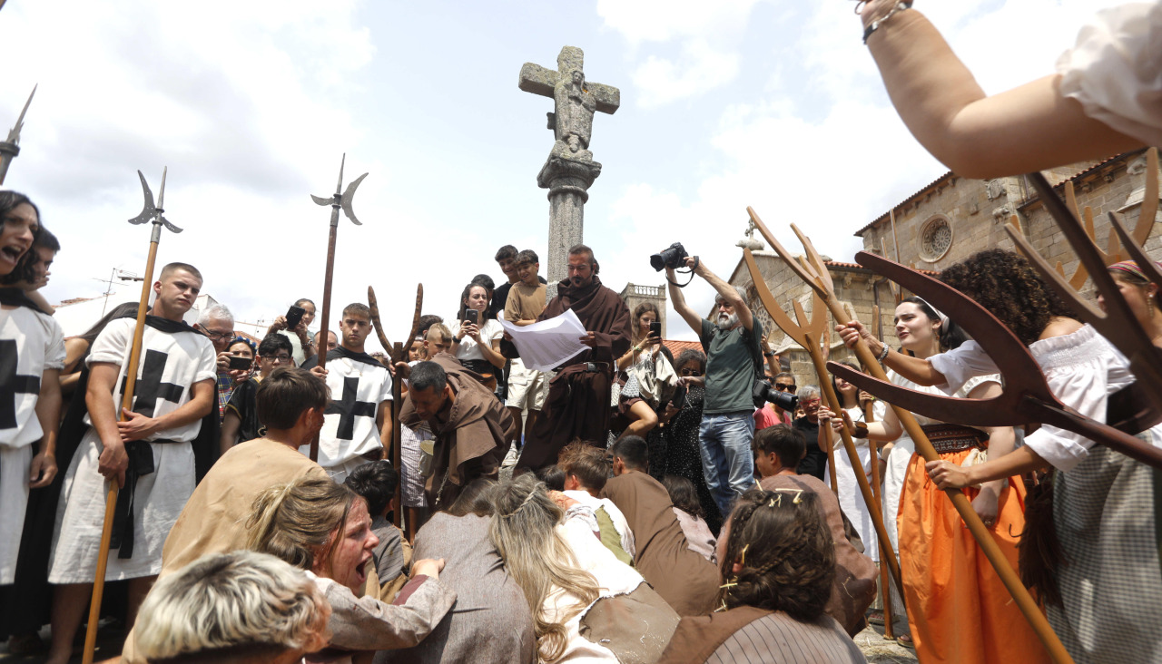 Casi dos centenares de voluntarios representan las cinco escenas históricas que, con el entorno monumental, son las claves del éxito de la Feira Franca de Betanzos. De coordinar a todos ellos se encarga el actor Ramiro Neira que, con otros compañeros de Artestudio, tomó el testigo del recordado Manuel Basoa. “Tuve el mejor de los maestros”, comenta el artista, que en menos de tres días interpreta, entre otros, al notario Xoán Branco; al mercader y adalid irmandiño Afonso de Carvallido o al fraile encargado de expulsar a los leprosos de Betanzos.