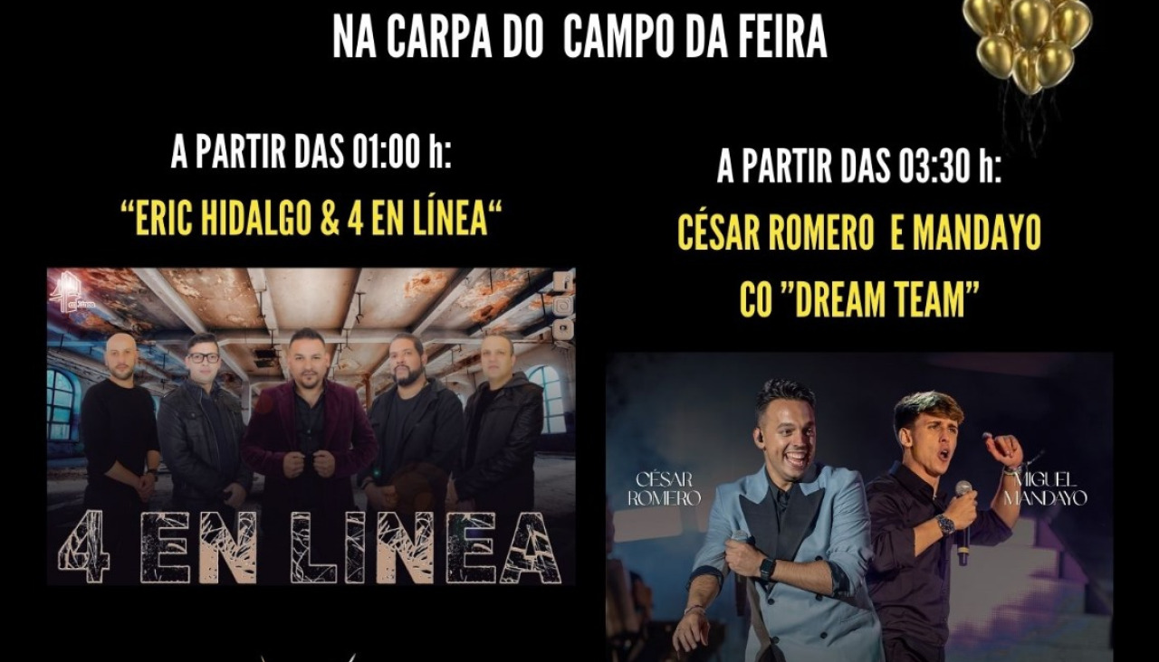 El Ayuntamiento de Carral dará la bienvenida al 2024 con una verbena que comenzará tras las campanadas en el Campo da Feira, y en la que actuarán Eric Hidalgo & 4 En Línea y los cantantes César Romero y Miguel Mandayo con el Dream Team de Cinema. Las actuaciones comenzarán en torno a las 01.00 horas, indicó Eric Hidalgo en un vídeo difundido por el Gobierno local en sus redes, en el que anima a los ciudadanos a celebrar el Año Nuevo en el municipio.