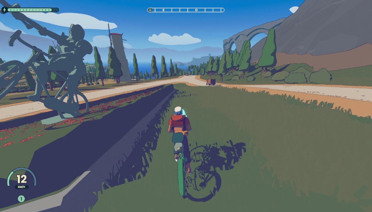 Cada una de estas carreras las deberemos ir buscando por el mundo abierto que nos propone Messhof Games. Para encontrarlas, tendremos primero que ir alcanzando los llamados Santuarios del Timbre, una suerte de atalayas que desbloquearán partes del mapa, nos introducirán a compañeros de Skull y, lo más importante, mejorarán una de las habilidades que nuestro compañero de viaje nos regalará y que será vital para las carreras: el impulso, o lo que es lo mismo, un acelerón limitado que podremos ir rellenando al ir a rebufo de otros ciclistas o llevando a cabo maniobras peligrosas como saltos o esquivar coches.