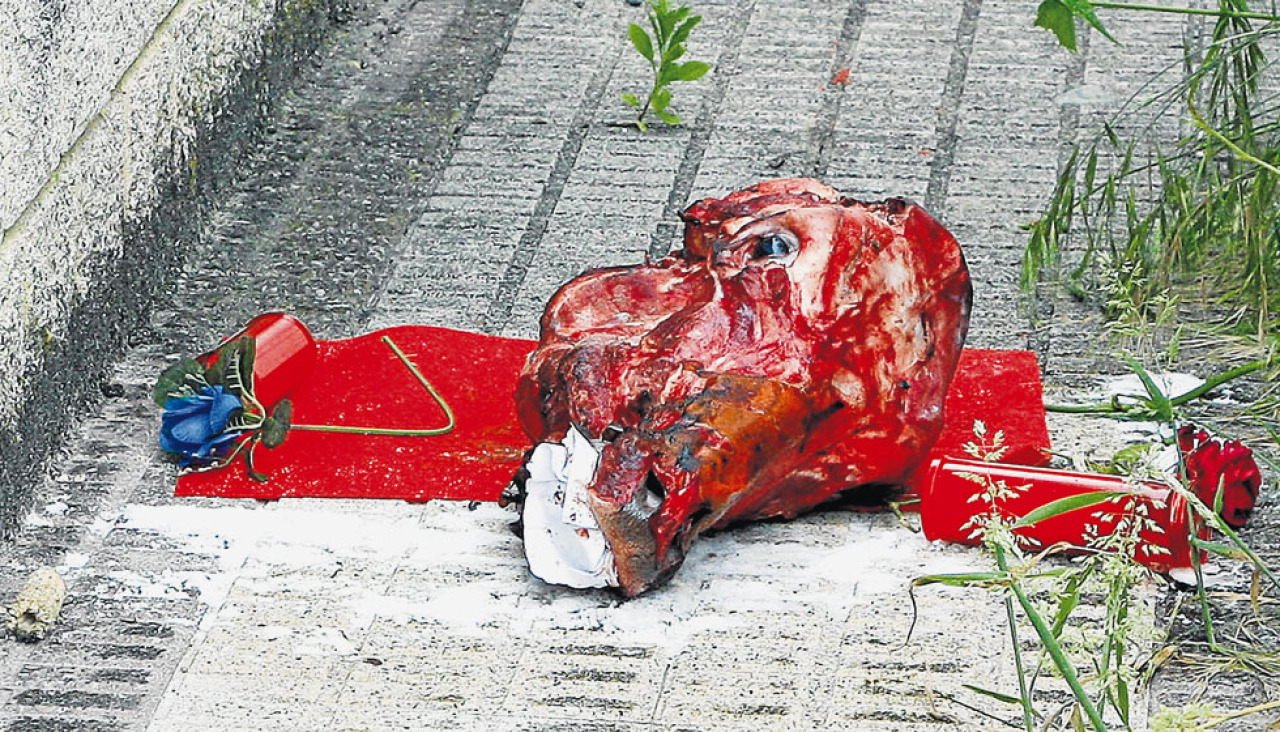 El señor, muy servicial y presuroso, sitúa ante mí una escalerilla de aluminio de dudosa consistencia. Bueno, mejor la muerte que esto. Así que, sin perder un segundo, me elevo sobre el muro, monto el 70-200 y le sacudo unas cuantas fotografías a aquel bodegón de película cutre de serie z. Una repugnante cabeza de vaca recubierta por enjambres de moscas, unas rosas falsas y unas velas del chino. Fascinante.