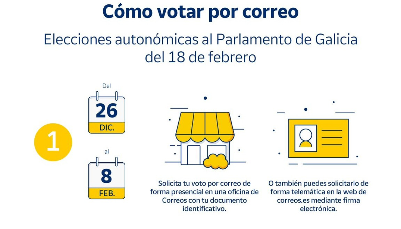 Los electores que deseen votar por correo en las elecciones autonómicas al Parlamento de Galicia todavía pueden solicitar hasta el día 8 de febrero (inclusive) el certificado de su inscripción en el Censo Electoral, vía online o presencialmente en cualquier oficina de Correos de España.