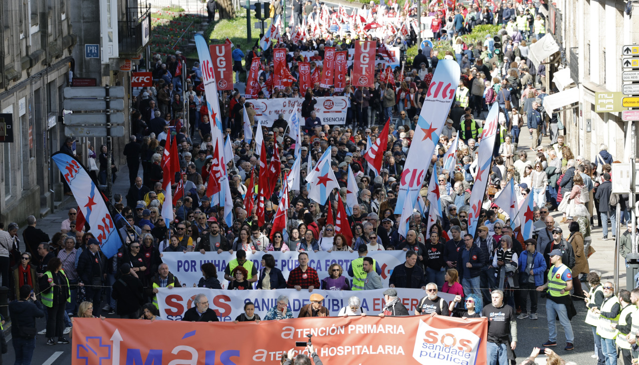 Miles de persoas marcharon este domingo en Santiago de Compostela para demandar máis recursos para que a sanidade pública galega teña a calidade que merecen os pacientes.