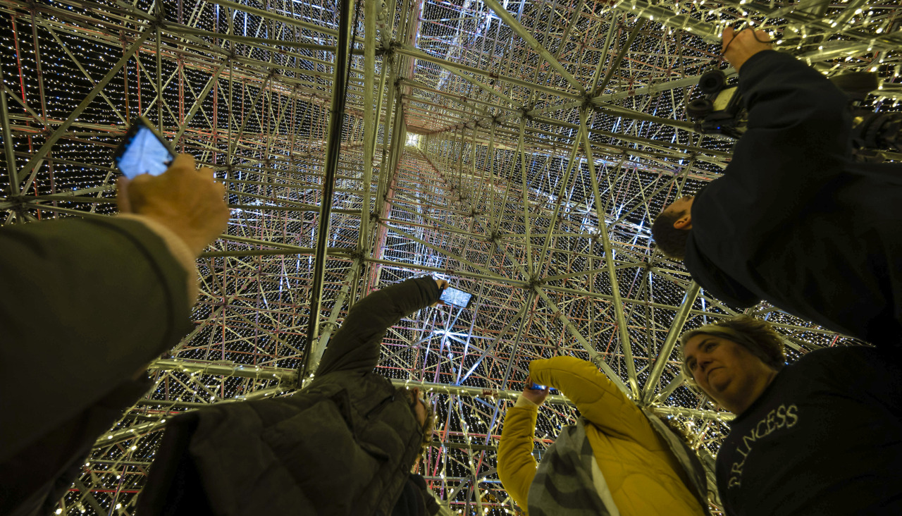 Con sus 65 metros de altura, 40 toneladas de metal y 24.000 metros de luces blancas, el árbol de Cartes ha congregado en este municipio, de apenas 6.000 habitantes, a locales expectantes y visitantes curiosos.