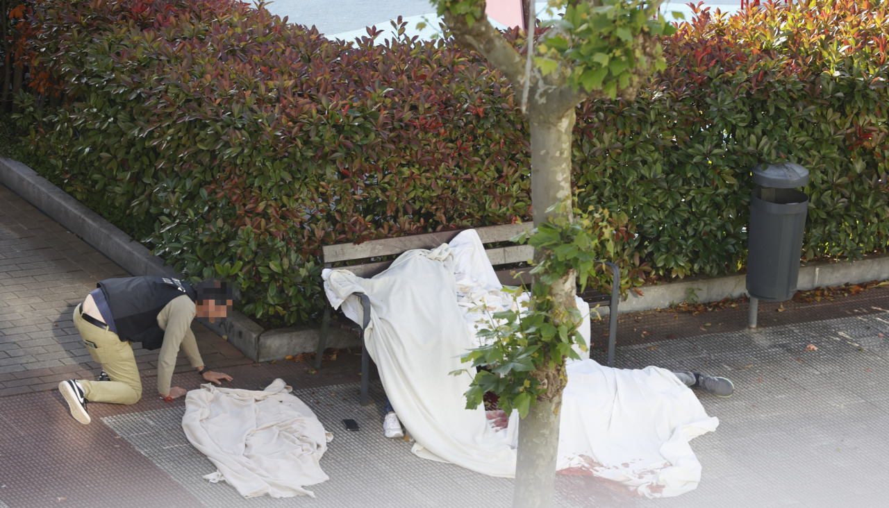 El cuerpo de la mujer se encontraba sentado en el banco, mientras que el del hombre estaba tendido en el suelo.