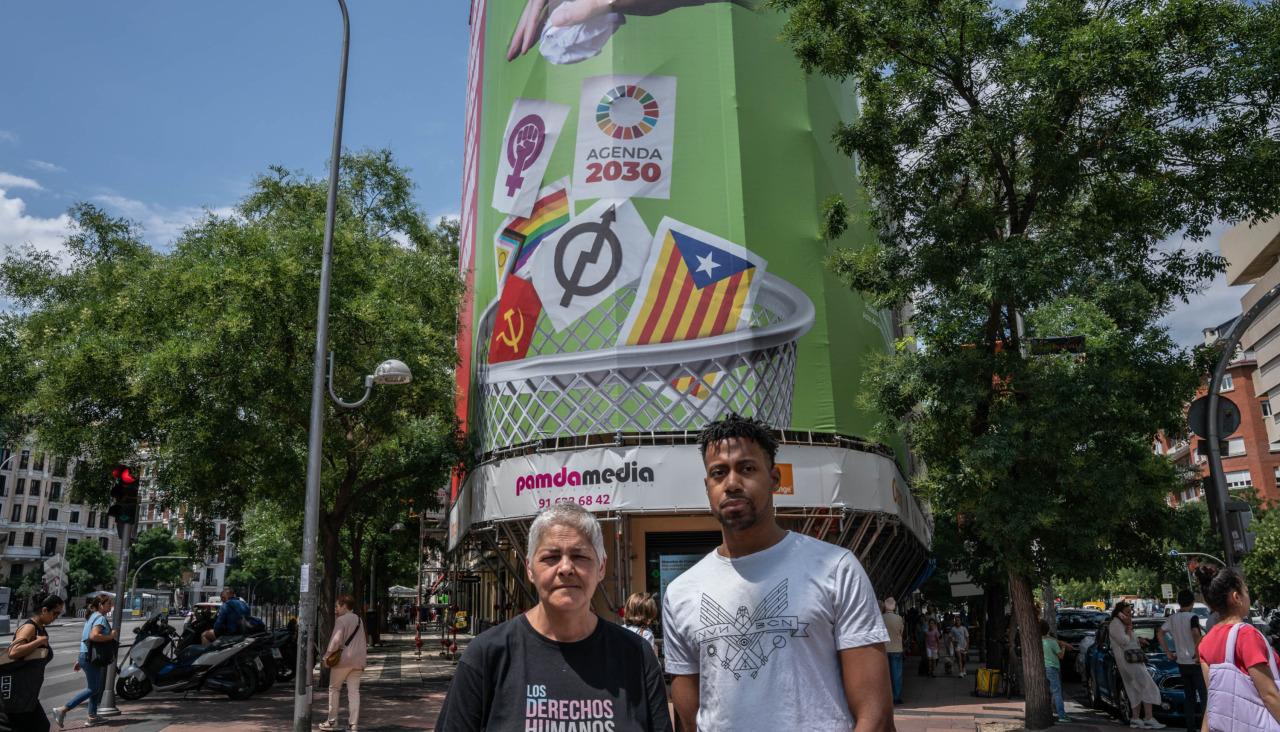 Vox retiró sobre el mediodía de ayer la lona en la que tiraba a la papelera las banderas Lgtbi, la del independentismo catalán, la comunista y logos del movimiento feminista y la Agenda 2030, tras el requerimiento de la Junta Electoral de Zona de Madrid para que la quitara en el plazo de un día al considerar que apelaba al voto al partido sin estar aún en campaña electoral.