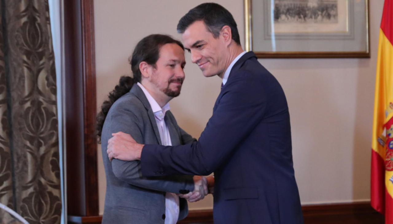 El presidente del Gobierno, el socialista Pedro Sánchez y el secretario general de Podemos, Pablo Iglesias, se han fundido este martes en un abrazo tras estampar su firma en el principio de acuerdo alcanzado dos días después de las elecciones para compartir un gobierno de coalición.