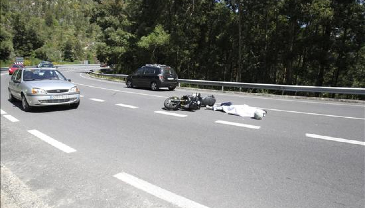 El motorista, que falleció en el acto, circulaba en una moto de gran cilindrada en sentido Tui y chocó frontolateralmente contra el vehículo en el que viajaban el matrimonio y el hijo, de unos ocho años.
