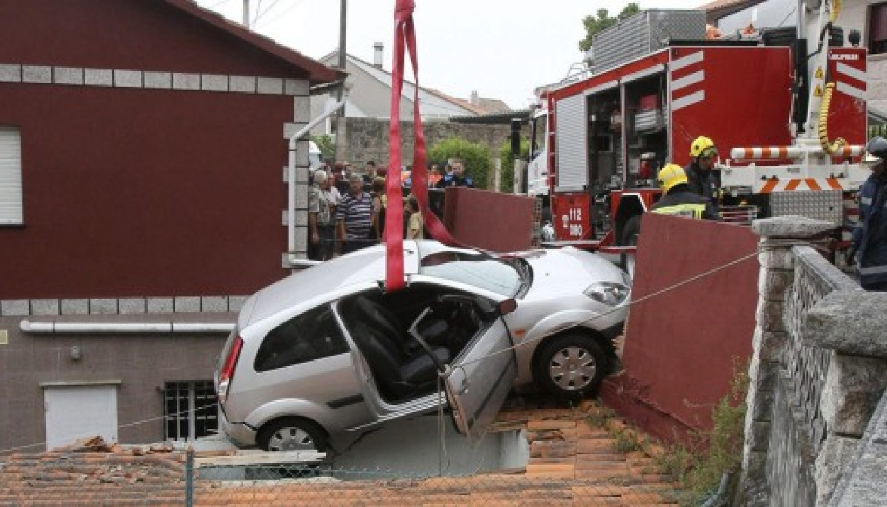 El vehículo se salió de la calzada al arrancar marcha atrás a la altura del número 36 de la calle Caneliñas y permaneció suspendido sobre el galpón desde las 15.40 hasta las 17.15, aproximadamente.