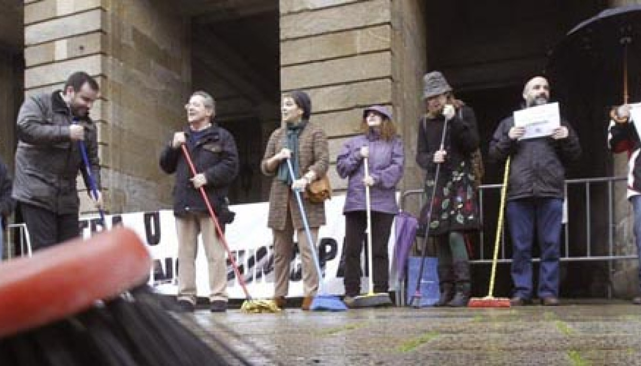 Unos santiagueses hartos de las informaciones sobre la supuesta corrupción que invade a su consistorio se fueron ayer a la puerta del mismo, fregona en mano, para intentar limpiarla.